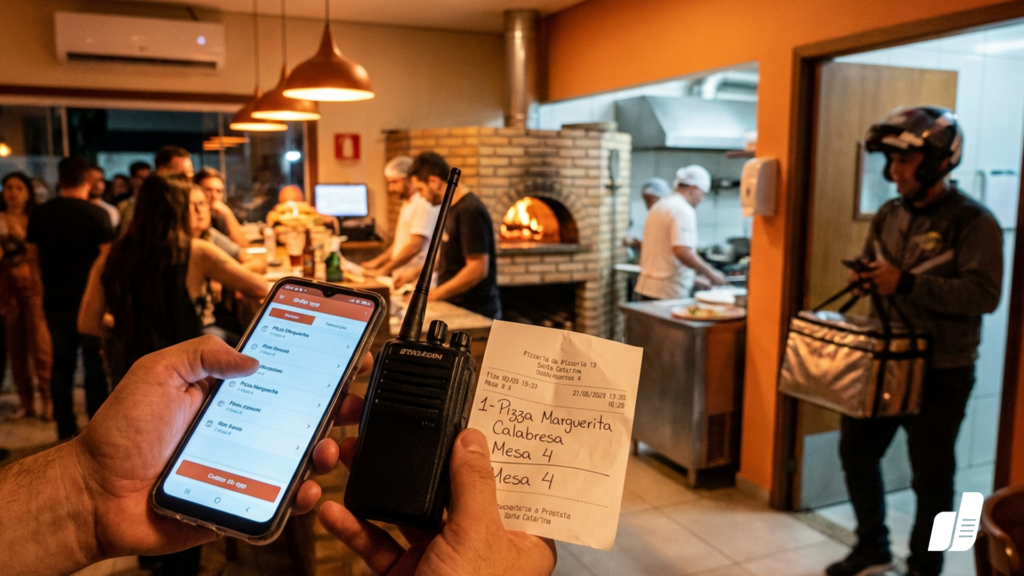 O maior problema entre o balcão e o forno é a comunicação. Na correria, o pedido é gritado, anotado em um papel que pode se perder, e o pizzaiolo fica sem saber o que é prioridade: o que chegou primeiro? O que é para viagem?